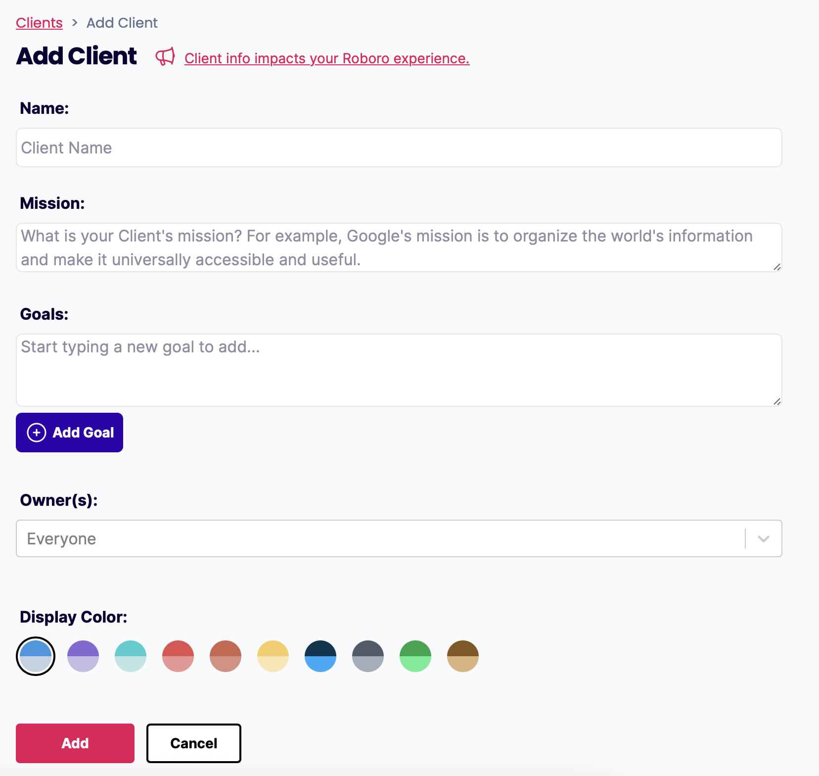 You can edit your Clients and their mission and goals at any time. To edit a Client, click anywhere within the box. When adding a new goal, be sure to press "Add Goal" to save.