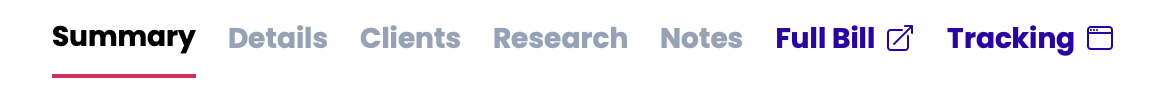 At the top of every bill page, you'll find a ribbon with quick-action buttons that let you jump between sections, view the full bill on the state legislature's website, or manage your tracking preferences. Click "Full Bill" to open the official bill page, and click "Tracking" to add or update who the bill is being tracked for.