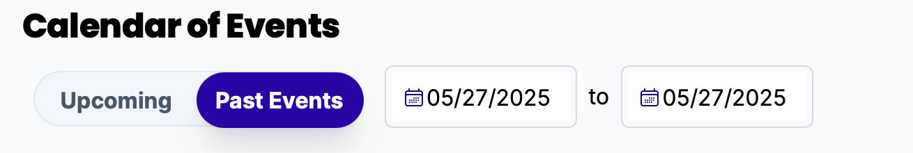To review events and meetings that have already happened, slide the toggle to "Past Events" and select a date range.
