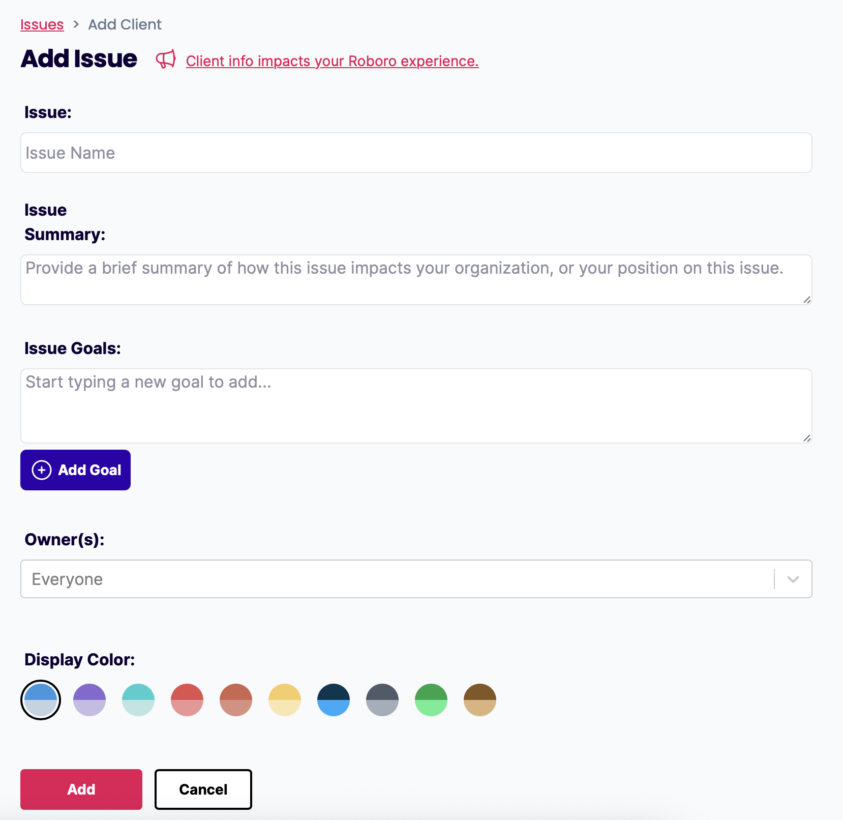 The Issues Dashboard is where you configure your issues, issue summaries and advocacy goal(s). You can update your Issues at any time. To save an Issue, add the Issue Name, Issue Summary, and at least one Goal. You can assign specific users as Issue "Owners" if you choose to.