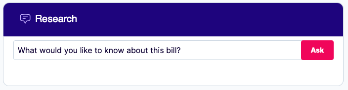 Bill Research is a tool that helps you quickly get up to speed on any piece of legislation. You can ask questions in plain language (just like you would in Google), and Roboro will return clear, relevant answers.