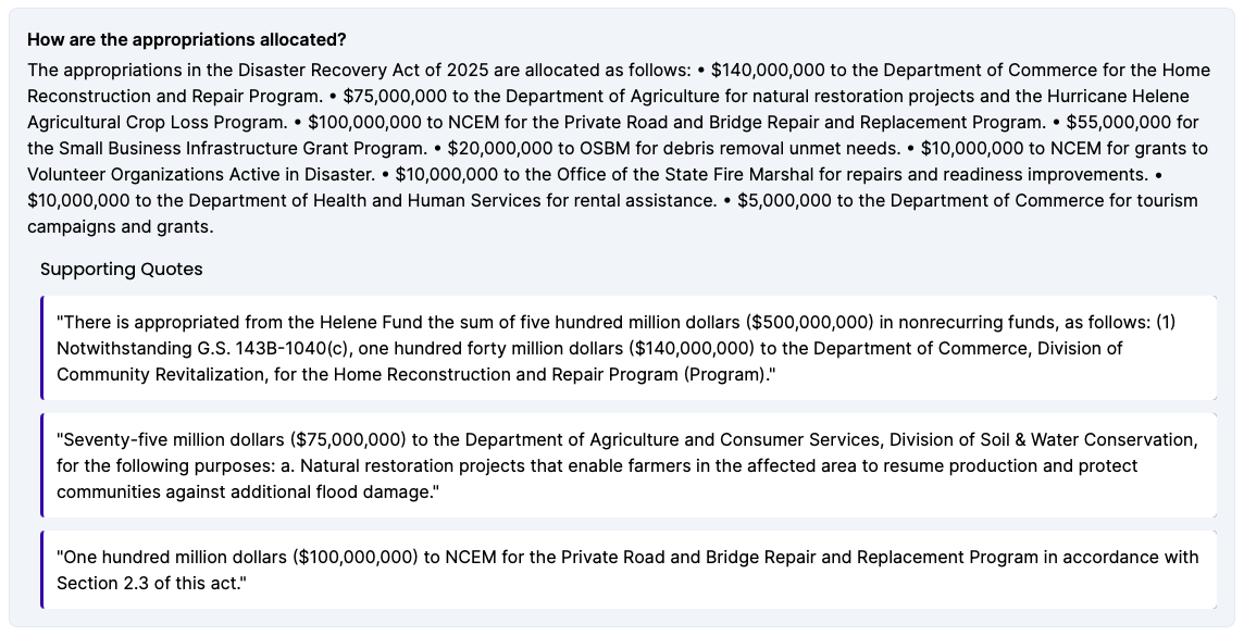 Responses are generated directly from the bill's text, so you can trust that the information is accurate to that legislation, without worrying about AI "hallucinations."