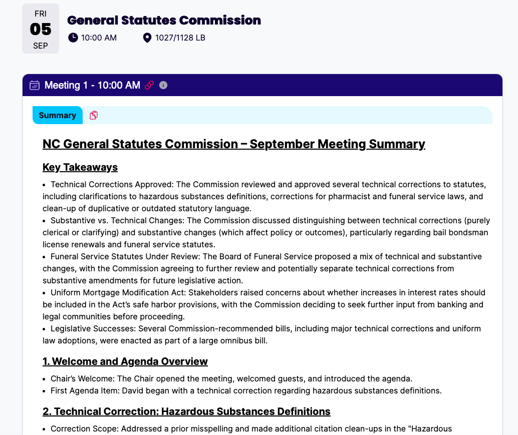 Summaries are available on any calendar event page, whether you navigate from the main calendar or from a specific bill page. If a transcript is available, the summary will appear at the top of the page for quick reference.